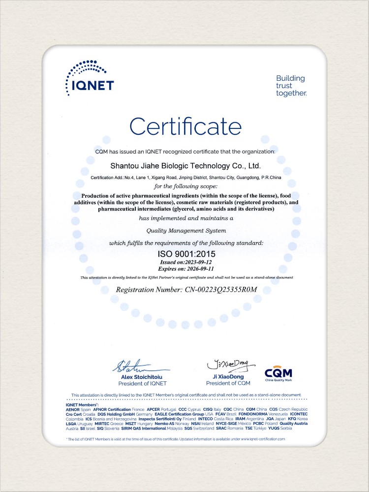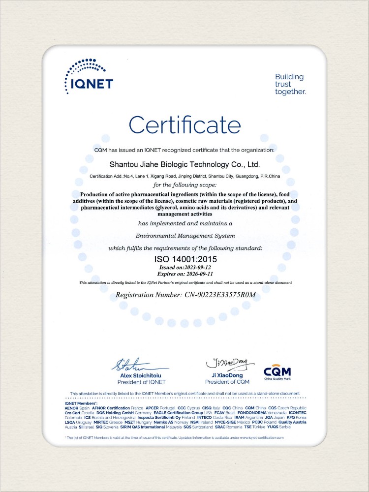 汕頭佳禾生物科技有限公司是一家致力于氨基酸及其衍生物研發(fā)、生產(chǎn)和銷(xiāo)售的國(guó)家高新技術(shù)企業(yè),先后通過(guò)了國(guó)家藥品GMP認(rèn)證,ISO9001質(zhì)量體系認(rèn)證、ISO14001環(huán)境管理體系認(rèn)證。目前,公司擁有“廣東省專(zhuān)精特新中小企業(yè)”、“廣東省氨基酸產(chǎn)品工程技術(shù)研究中心”、“汕頭市生物發(fā)酵工程技術(shù)研究開(kāi)發(fā)中心”、“汕頭市知識(shí)產(chǎn)權(quán)優(yōu)勢(shì)企業(yè)”、“多項(xiàng)國(guó)家發(fā)明專(zhuān)利”、“廣東省守合同重信用企業(yè)”等多項(xiàng)資質(zhì)和榮譽(yù),旗下“佳禾牌”系列產(chǎn)品已成為原料藥行業(yè)知名品牌。 新泰市佳禾生物科技有限公司成立于2012年8月,注冊(cè)資金2億元,公司位于山東泰安新泰市新汶工業(yè)園區(qū),是國(guó) 家級(jí)高新技術(shù)企業(yè)、山東省“專(zhuān)精特新”企業(yè)、山東省制造業(yè)單項(xiàng)冠軍企業(yè)、泰安市科技型中小企業(yè)、泰安市農(nóng)業(yè)產(chǎn)業(yè)化龍頭企業(yè)、中國(guó)生物發(fā)酵產(chǎn)業(yè)協(xié)會(huì)理事單位。